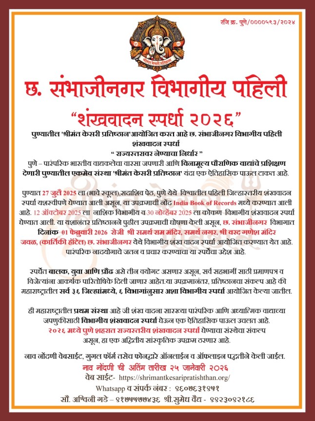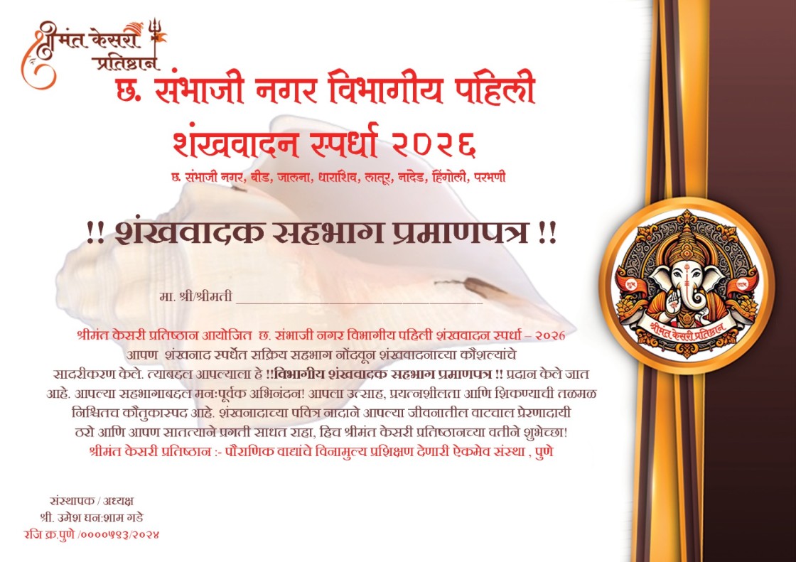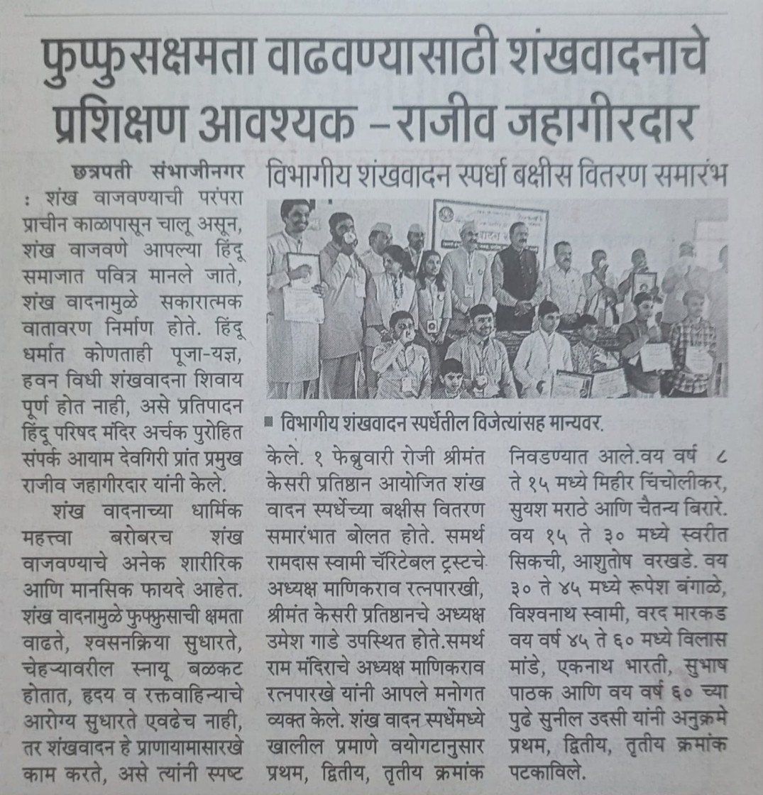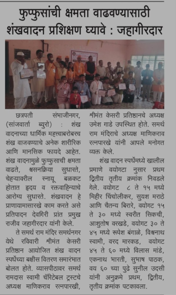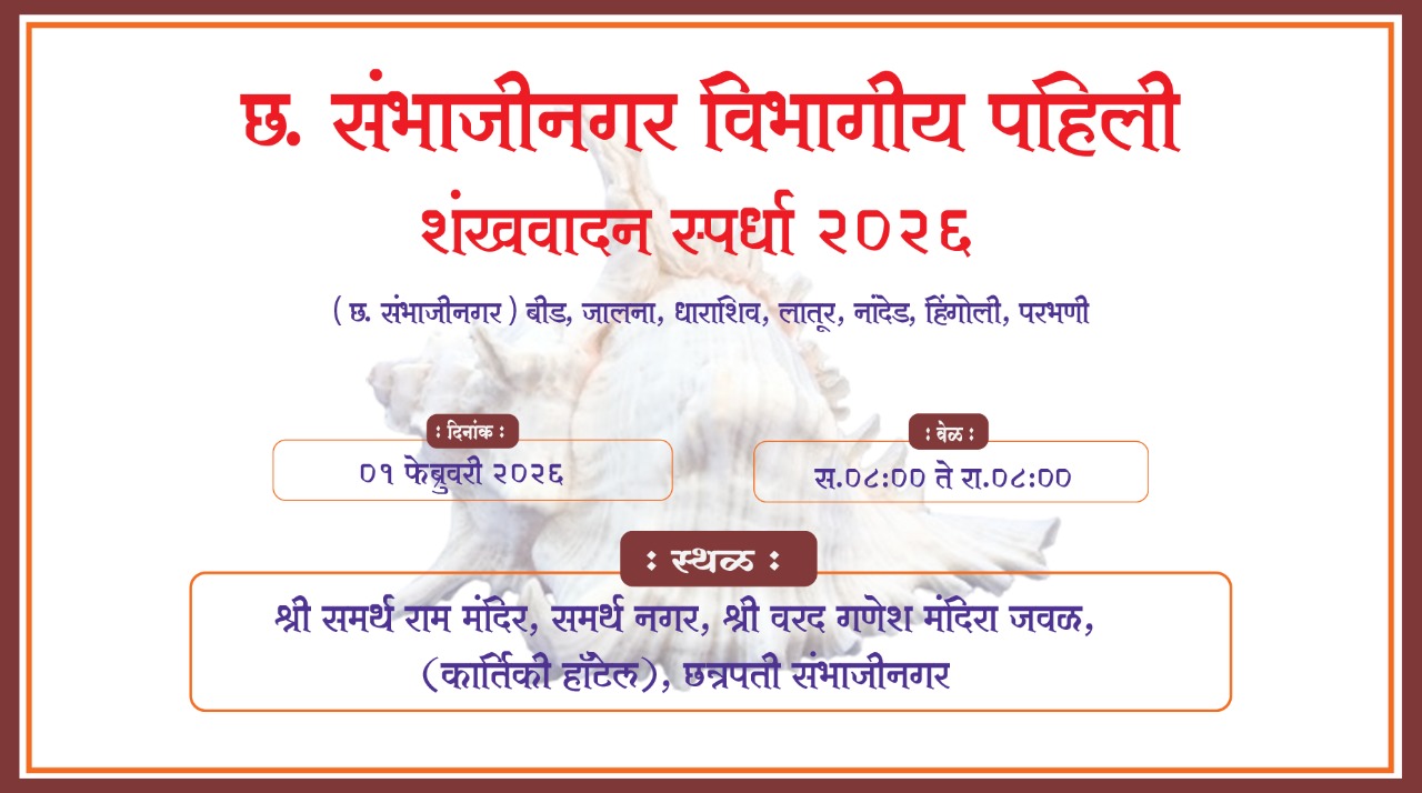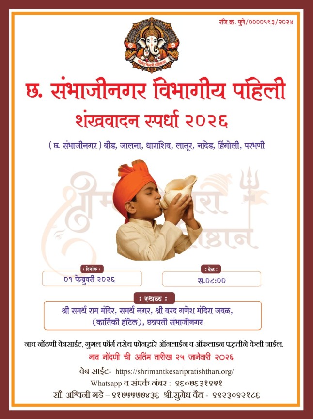 २ फेब्रुवारी २०२६ (रविवार): श्रीमंत केसरी प्रतिष्ठान, पुणे यांच्या वतीने छ. संभाजीनगर विभागीय पहिली शंख वादन स्पर्धाचे भव्य आयोजन छ. संभाजीनगर येथील श्री समर्थ राम मंदिर समर्थ नगर,श्री वरद गणेश मंदिर जवळ, छत्रपती संभाजी नगर ,येथे पार पडली.ही स्पर्धा छ. संभाजीनगर विभागासाठी घेण्यात आली होती. यात छत्रपती संभाजीनगर, जालना, बीड, धाराशिव, लातूर, नांदेड, परभणी आणि हिंगोली जिल्ह्यांमधून विविध वयोगटांतील शंखवादक मोठ्या संख्येने सहभागी झाले होते. स्पर्धेसाठी ५ वयोगट बनविण्यात आले होते. प्रत्येक गटातून प्रथम, द्वितीय आणि तृतीय क्रमांक विजेत्यांना सन्मानचिन्ह व प्रमाणपत्र देऊन गौरविण्यात आले. तसेच ५ उत्तेजनार्थ पारितोषिके व सर्व सहभागी स्पर्धकांना सहभाग प्रमाणपत्र प्रदान करण्यात आले.
