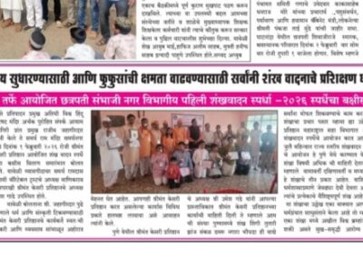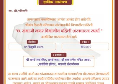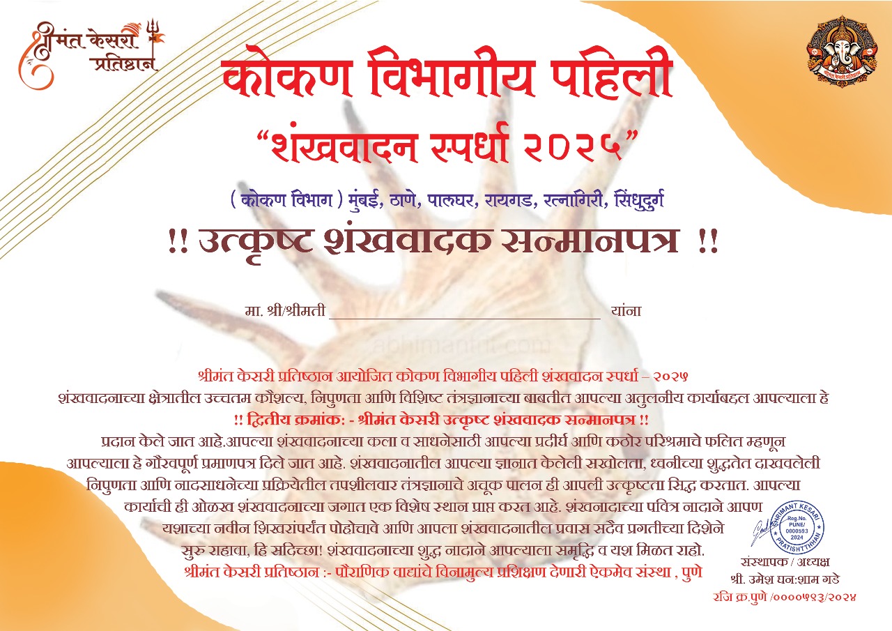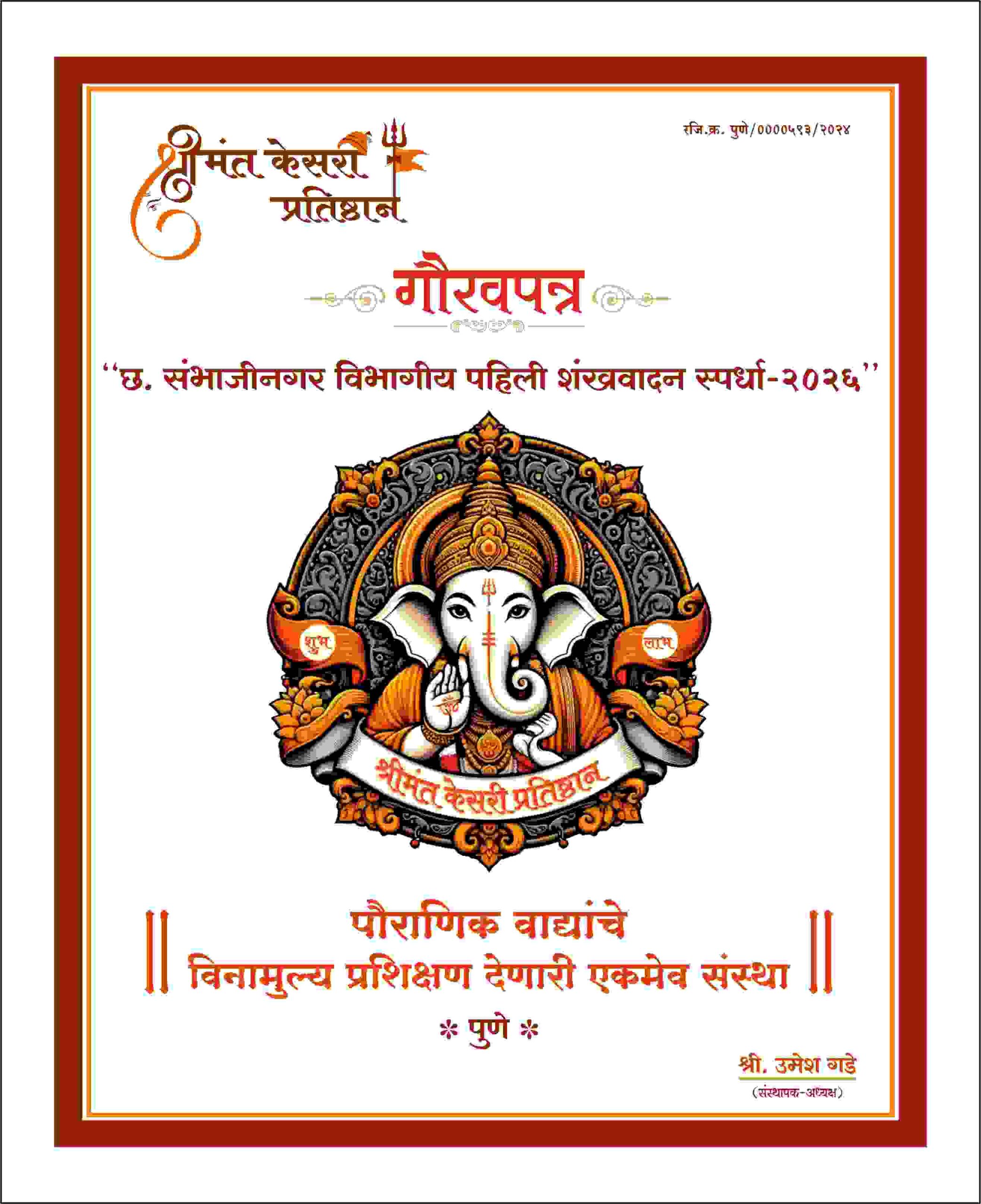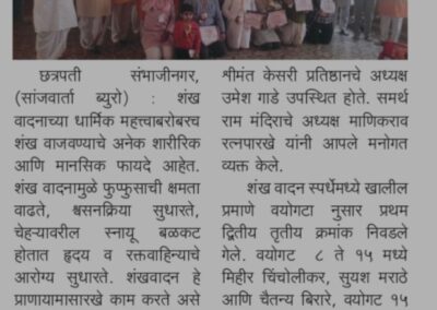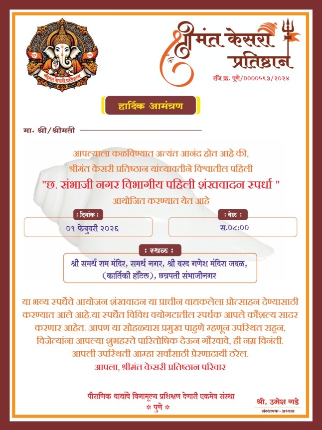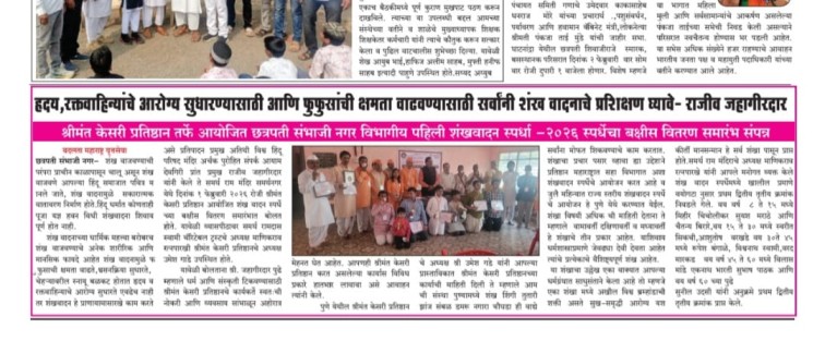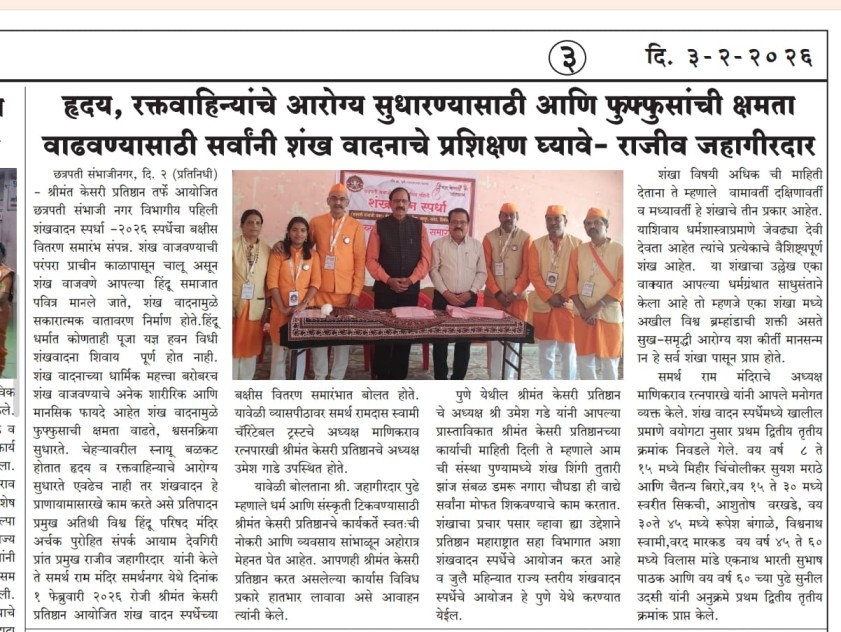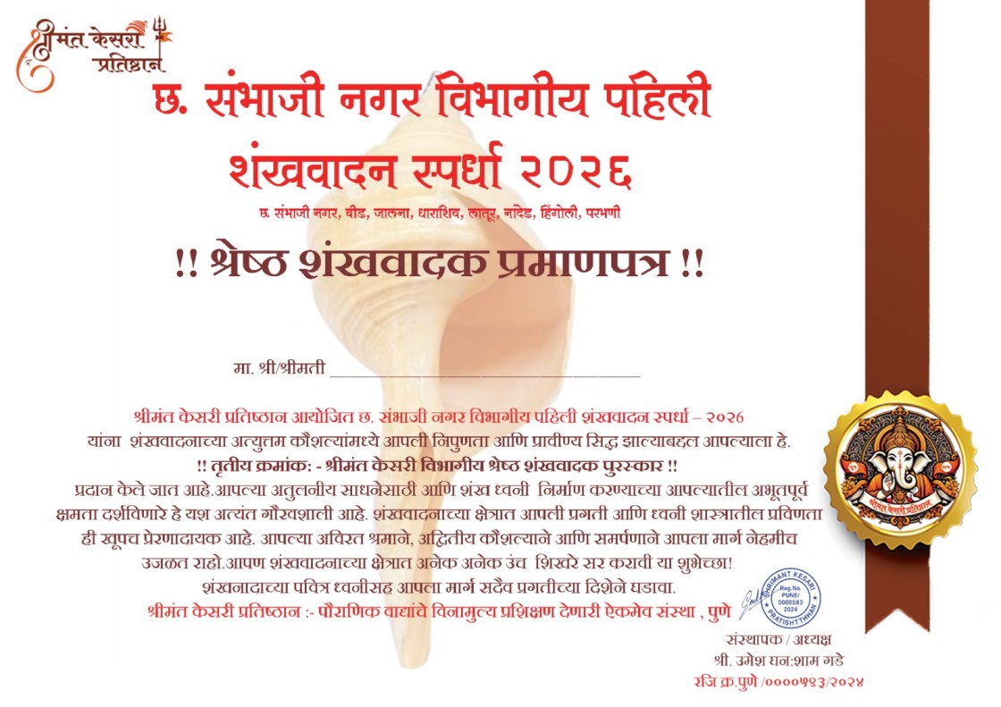 २ फेब्रुवारी २०२६ (रविवार): श्रीमंत केसरी प्रतिष्ठान, पुणे यांच्या वतीने छ. संभाजीनगर विभागीय पहिली शंख वादन स्पर्धाचे भव्य आयोजन छ. संभाजीनगर येथील श्री समर्थ राम मंदिर समर्थ नगर,श्री वरद गणेश मंदिर जवळ, छत्रपती संभाजी नगर ,येथे पार पडली.ही स्पर्धा छ. संभाजीनगर विभागासाठी घेण्यात आली होती. यात छत्रपती संभाजीनगर, जालना, बीड, धाराशिव, लातूर, नांदेड, परभणी आणि हिंगोली जिल्ह्यांमधून विविध वयोगटांतील शंखवादक मोठ्या संख्येने सहभागी झाले होते. स्पर्धेसाठी ५ वयोगट बनविण्यात आले होते. प्रत्येक गटातून प्रथम, द्वितीय आणि तृतीय क्रमांक विजेत्यांना सन्मानचिन्ह व प्रमाणपत्र देऊन गौरविण्यात आले. तसेच ५ उत्तेजनार्थ पारितोषिके व सर्व सहभागी स्पर्धकांना सहभाग प्रमाणपत्र प्रदान करण्यात आले.